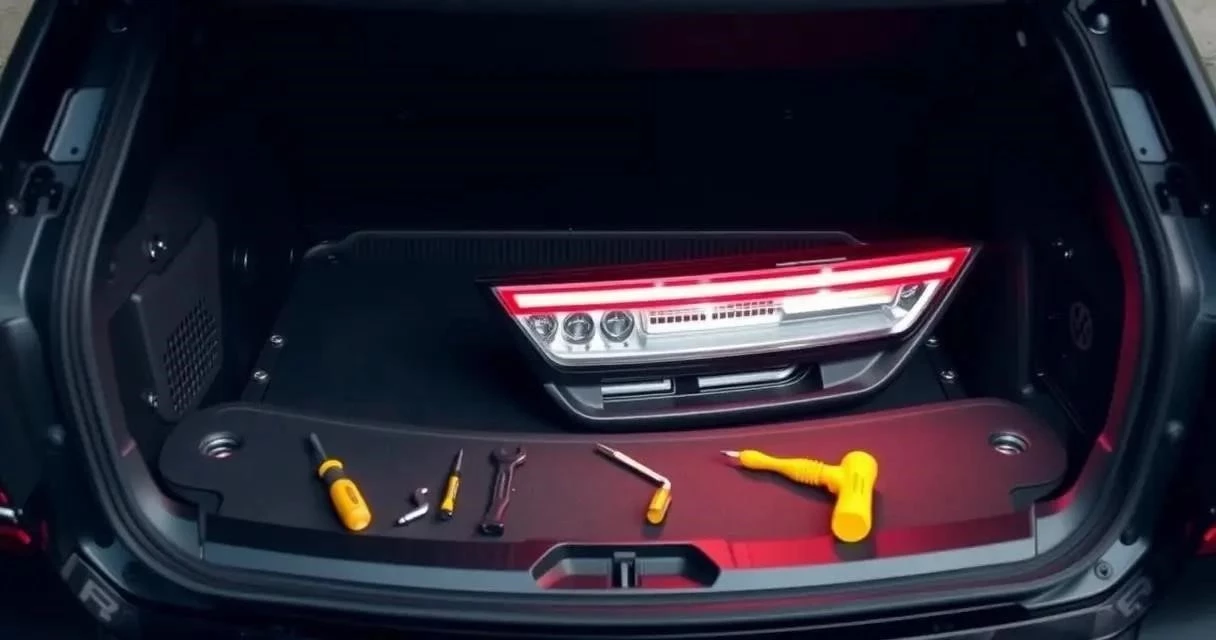 - Откройте багажник и снимите крышку доступа к фонарю.