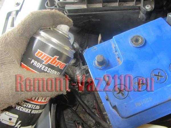 Когда аккумулятор стоит на своем месте, перед тем, как надеть клеммы, наносим специальную смазку для электрических контактов: