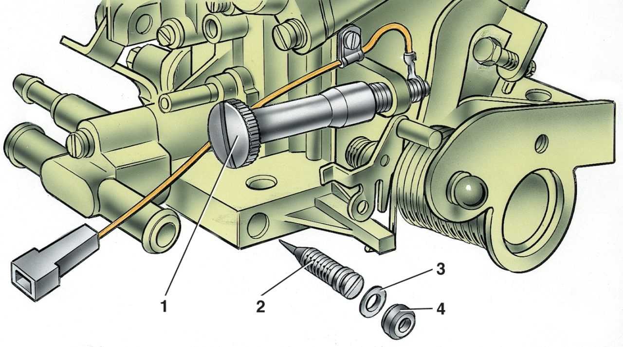 Винты регулировки системы холостого хода карбюратора 21053-1107010: 1 — регулировочный винт количества смеси; 2 — регулировочный винт качества (состава) смеси; 3 — уплотнительное кольцо; 4 — заглушка регулировочного винта
