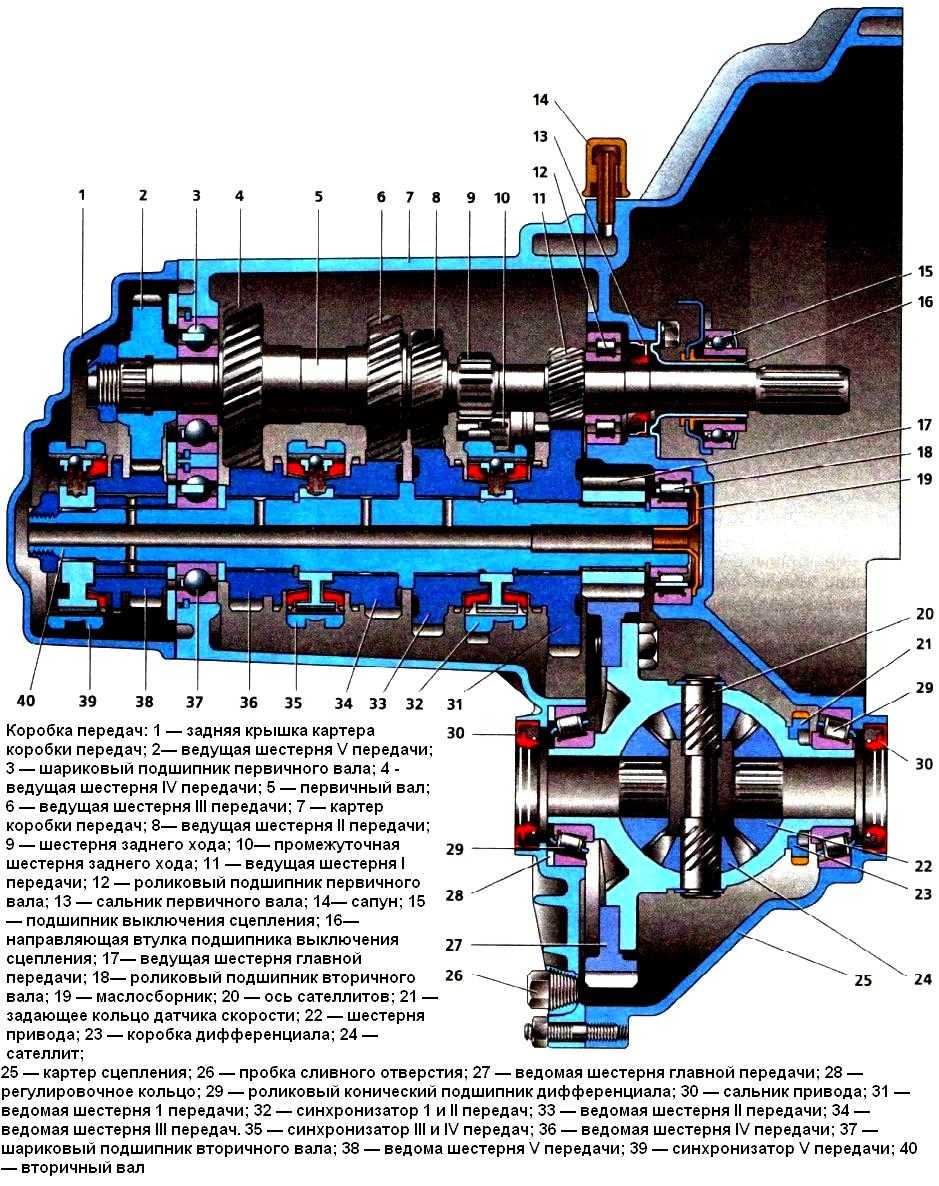 Коробка передач: 1 – подшипник выключения сцепления; 2 – направляющая втулка; 3 – первичный вал; 4 – роликовый подшипник вторичного вала; 5 – вторичный вал; 6 – стопорное кольцо; 7 – ось сателлитов; 8 – ведущая шестерня привода спидометра; 9 – заглушка транспортная; 10 – сальник привода колеса; 11 – роликовый конический подшипник дифференциала; 12 – шестерня полуоси; 13 – сателлит; 14 – коробка дифференциала; 15 – картер сцепления; 16 – ведомая шестерня главной передачи; 17 – пробка сливного отверстия; 18 – регулировочное кольцо; 19 – ведомая шестерня I передачи вторичного вала; 20 – синхронизатор I и II передачи в сборе; 21 – ведомая шестерня II передачи вторичного вала; 22 – стопорное кольцо; 23 – упорное полукольцо; 24 – ведомая шестерня III передачи вторичного вала; 25 – синхронизатор III и IV передачи в сборе; 26 – ведомая шестерня IV передачи вторичного вала; 27 – игольчатый подшипник шестерен вторичного вала; 28 – шариковый подшипник вторичного вала; 29 – упорная пластина; 30 – ведомая шестерня V передачи вторичного вала; 31 – синхронизатор V передачи в сборе; 32 – гайка; 33 – упорная шайба; 34 – ведущая шестерня V передачи первичного вала; 35 – задняя крышка картера коробки передач; 36 – шариковый подшипник первичного вала; 37 – картер коробки передач; 38 – роликовый подшипник первичного вала; 39 – сапун; 40 – сальник первичного вала