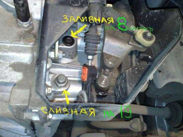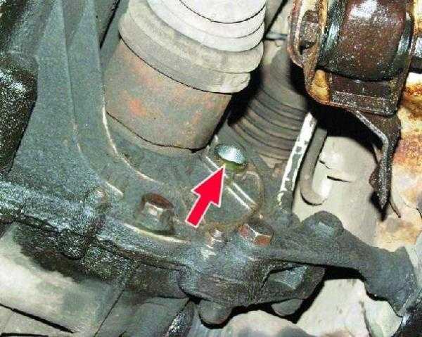 На фото стрелкой справа показано сливное отверстие КПП ВАЗ 2114.
