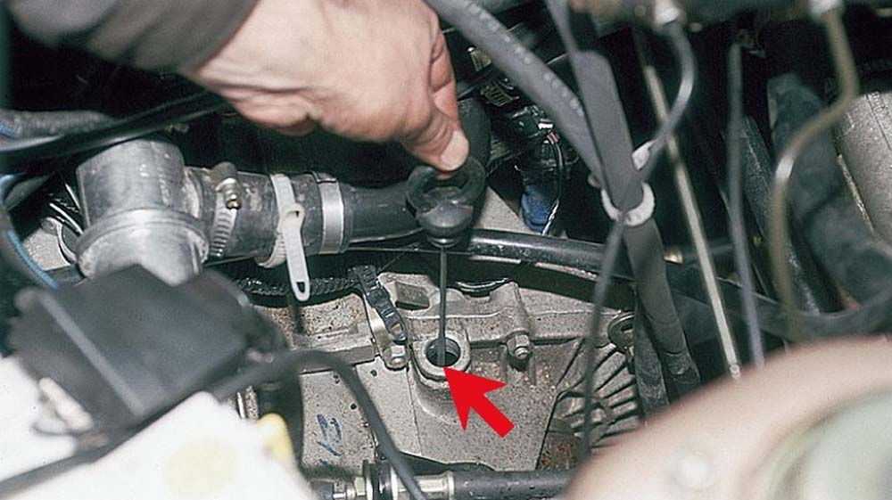 - Выкрутите щуп из КПП (расположен рядом с термостатом и стартером).