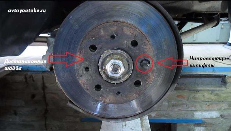 - Устанавливаем тормозной диск на ступицу. Не забываем про дистанционное кольцо (шайбу). Через неё вставляем направляющие штифты, смазав их нигролом или «графиткой». Затягиваем их, вприсовывая суппорт в тормозной диск.