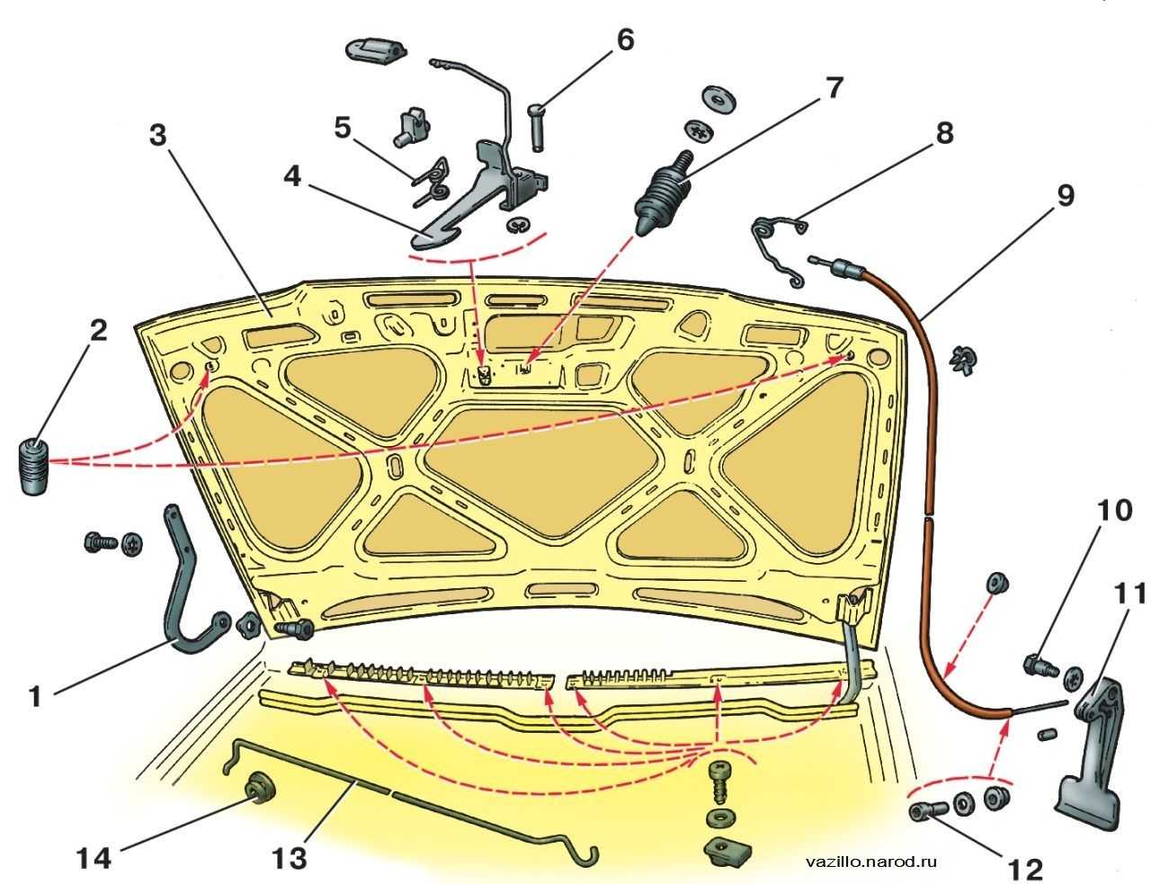 Детали капота и замка: 1 – петля капота; 2 – буфера; 3 – капот; 4 – крючок; 5 – пружина крючка; 6 – ось крючка; 7 – штырь; 8 – пружина замка; 9 – оболочка с тягой замка; 10 – ось рукоятки; 11 – рукоятка замка; 12 – втулка оболочки тяги; 13 – оболочка с тягой замка; 14 – втулка упора капота
