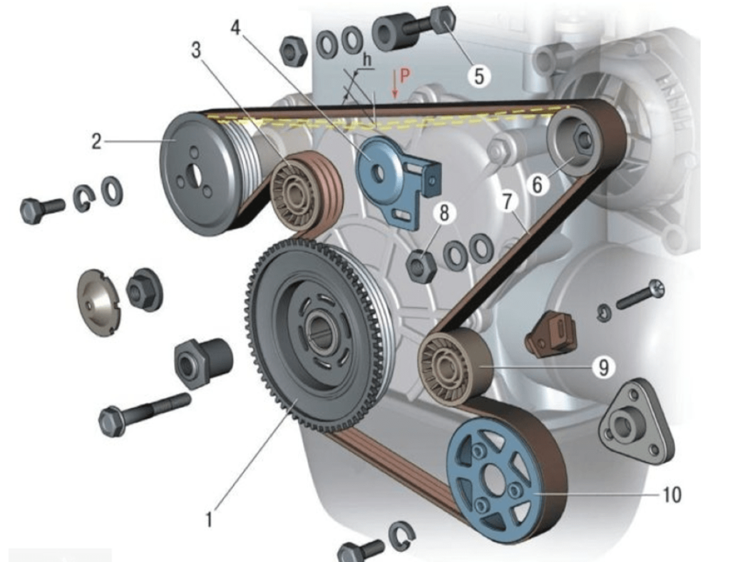 Правильно натянутый ремень генератора на Шевроле Ниву можно проверить, надавив на него в точке P, обозначенной на рисунке. При усилии 75Н допустимый прогиб должен составить 1-1,2 сантиметра.