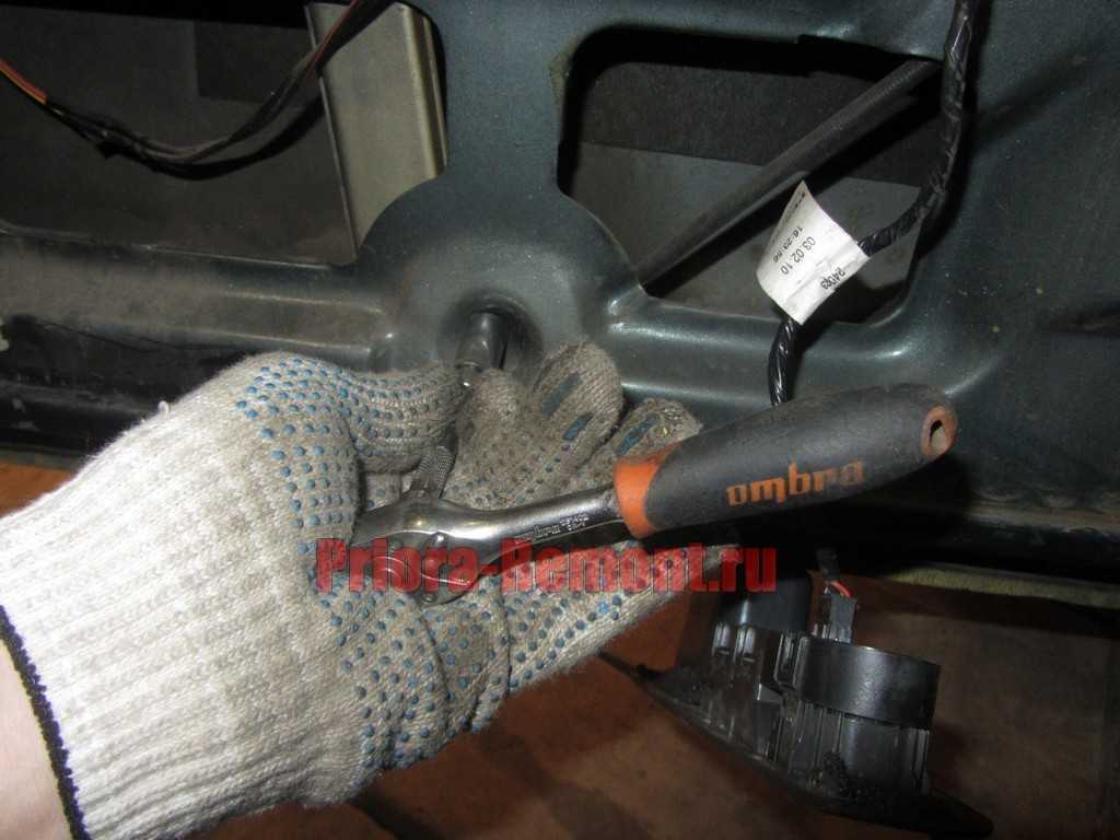 Чтобы во время выполнения этого ремонта, стекло не падало вниз, необходимо его зафиксировать, подставив или подложив что-либо между ним и внутренней частью двери. Далее можно откручивать все гайки крепления электростеклоподъемника.
