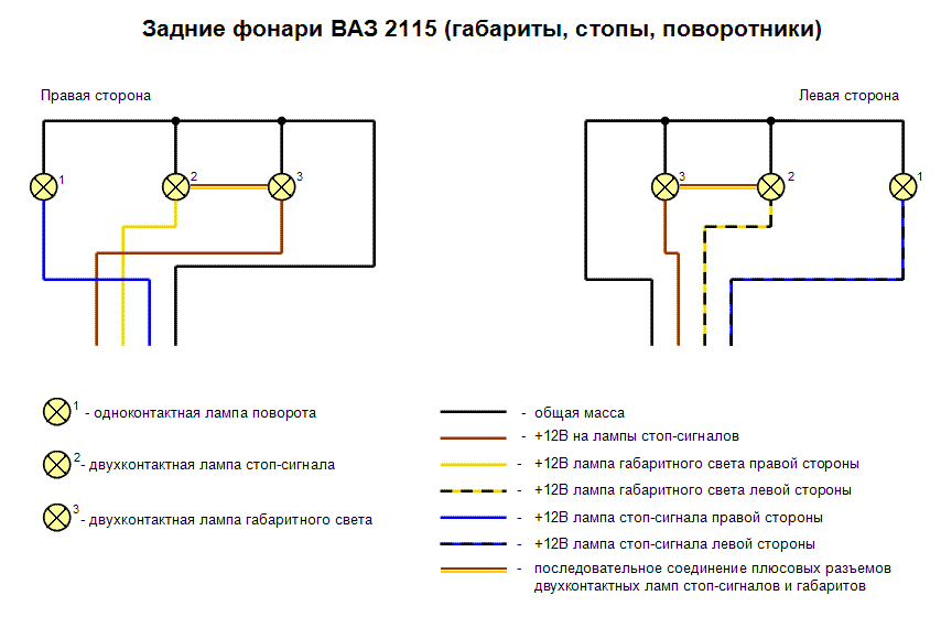 Электрическая схема задних фонарей ВАЗ 2108-2115 из книжки. Все вроде более чем понятно, общая масса и плюсы на каждый патрон.