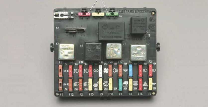 | F3 | дальний свет в левой фаре, контрольная лампа включения дальнего света фар на приборной панели. Аналогично реле К5. | 10 А |