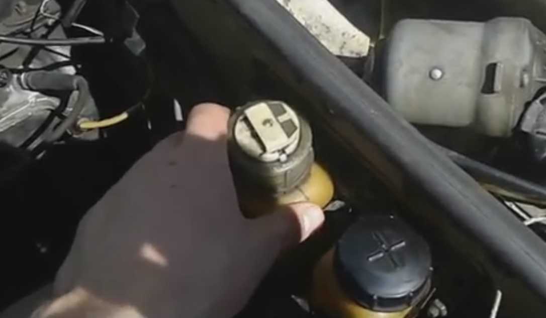 При помощи ключа на 10 мм откручивается крепежный хомут, бачка с рабочей жидкостью, откручивается и пробка.