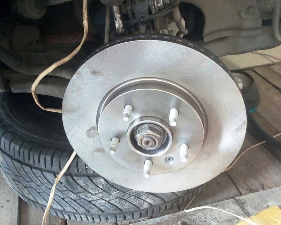 - Потом в последовательности, обратной снятию водружаем все элементы, в том числе новый или отремонтированный тормозной диск на свои места. Чтобы установить шпильки обратно, можно использовать гайки колес, накрутив их на концы шпилек. Нужно равномерно затягивать эти гайки, чтобы ровно запрессовать шпильки обратно в диск и ступицу.