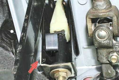 В салоне под панелью приборов ключом «на 8» отверните гайку крепления упора оболочки троса к кронштейну педалей и снимите упор с кронштейна.