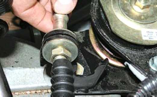 Ключом «на 17» отверните гайку крепления наконечника к кронштейну на коробке передач, удерживая вторым ключом наконечник от проворачивания