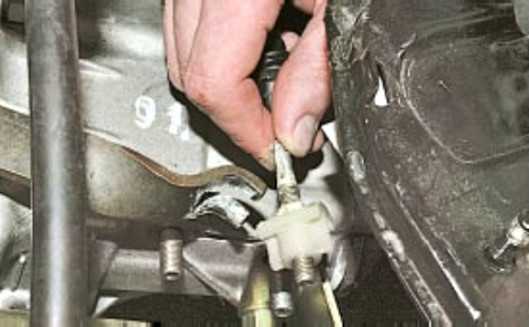 Потянув наконечник троса вперед по направлению движения автомобиля, выведите наконечник из паза вилки выключения сцепления
