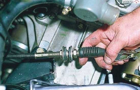 Введите наконечник троса в паз вилки выключения сцепления и отпустите — под действием пружины поводок наконечника должен установиться на вилку без зазора.