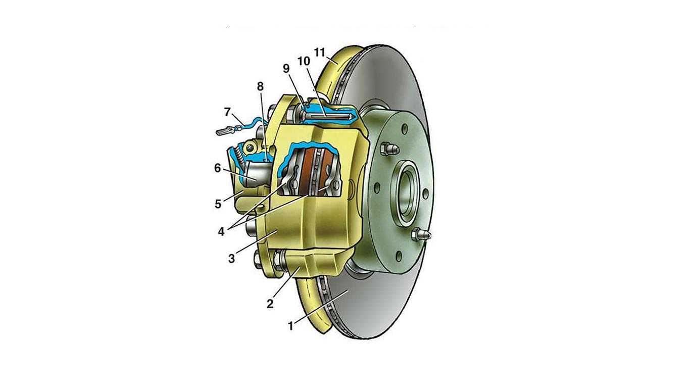 Тормозной механизм переднего колеса: 1 – тормозной диск; 2 – направляющая колодок; 3 – суппорт; 4 – тормозные колодки; 5 – цилиндр; 6 – поршень; 7 – уплотнительное кольцо; 8 – защитный чехол направляющего пальца; 9 – направляющий палец; 10 – защитный кожух