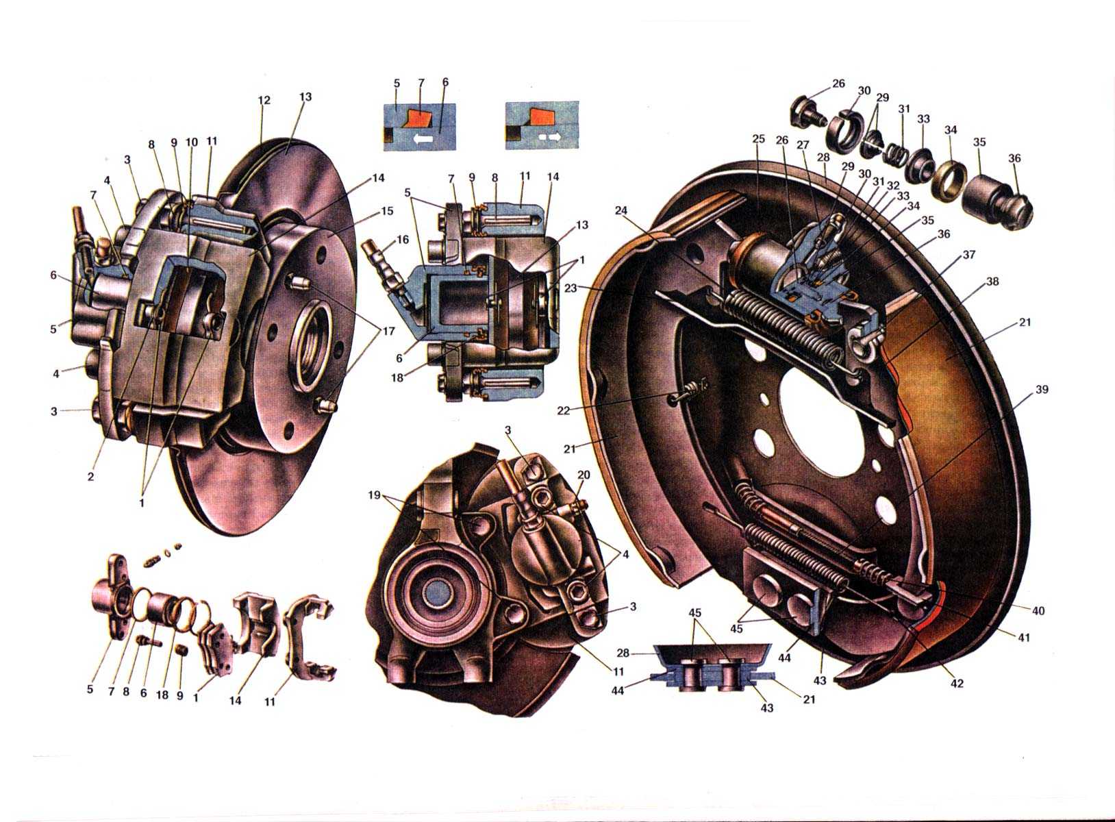 1. Колодки тормоза; 2. Поджимная пружина колодки; 3. Болты крепления цилиндра к направляющим пальцам; 4. Болты, соединяющие цилиндр с суппортом; 5. Цилиндр; 6. Поршень: 7. Уплотнительное кольцо; 8. Направляющий палец; 9. Защитный чехол пальца; 10. Накладка колодки; 11. Направляющая колодок; 12. Защитный кожух; 13. Диск тормоза; 14. Суппорт; 15. Ступица переднего колеса; 16. Шланг тормозного цилиндра: 17. Направляющие штифты; 18. Защитный чехол поршня; 19. Болты креплений тормозного механизма к поворотному кулаку; 20. Штуцер для прокачки привода тормозного механизма; 21. Колодка тормозного механизма; 22. Направляющая пружина колодки; 23. Разжимная планка; 24. Верхняя стяжная пружина колодок; 25. Защитный колпачок колесного цилиндра; 26. Упорный винт; 27. Штуцер для прокачки привода тормозного механизма; 28. Шит тормоза; 29. Сухари; 30. Упорное кольцо: 31. Пружина; 32. Штуцер трубки подвода жидкости; 33. Опорная чашка; 34. Уплотнитель; 35. Поршень колесного цилиндра; 36. Упор колодки; 37. Палец рычага ручного привода колодок; 38. Рычаг ручного привода тормозных колодок; 39. Трос привода стояночного тормоза; 40. Пружина троса; 41. Наконечник троса; 42. Нижняя стяжная пружина колодок; 43. Опорная пластина колодок; 44. Направляющая пластина колодок; 45. Заклепки крепления пластин.