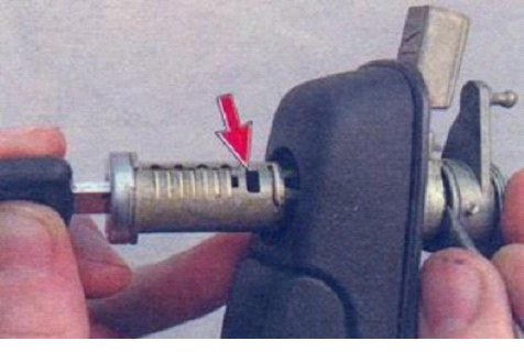 - Стальной линейкой, ножом или тонкой отвёрткой нужно надавить на язычок-фиксатор, расположенный напротив прорези в корпусе личинки. Нужно подвести отвёртку между вращающейся и неподвижной частью механизма. Знайте, что в водительской двери прорезь сделана снизу (смотрит «в пол»), в пассажирских дверях – сверху!